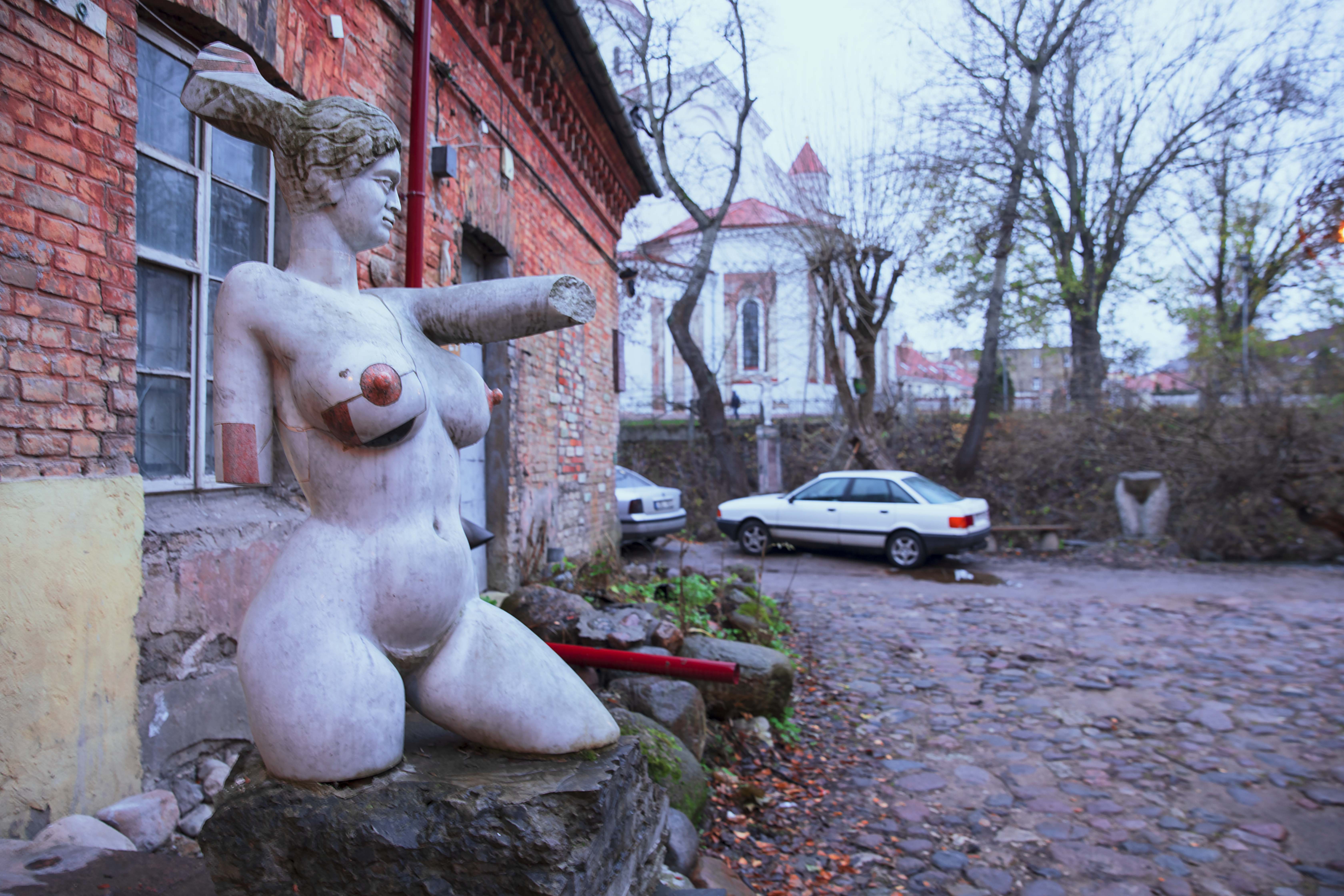 I know what you are thinking… I believe the name of the building in the middle of the picture is Orthodox Cathedral of the Theotokos – lol. The female statue, on the other hand, is a vivid representation of Užupis’ artistic character. Expect to see some quirky murals and installations as you explore this beautiful neighborhood.