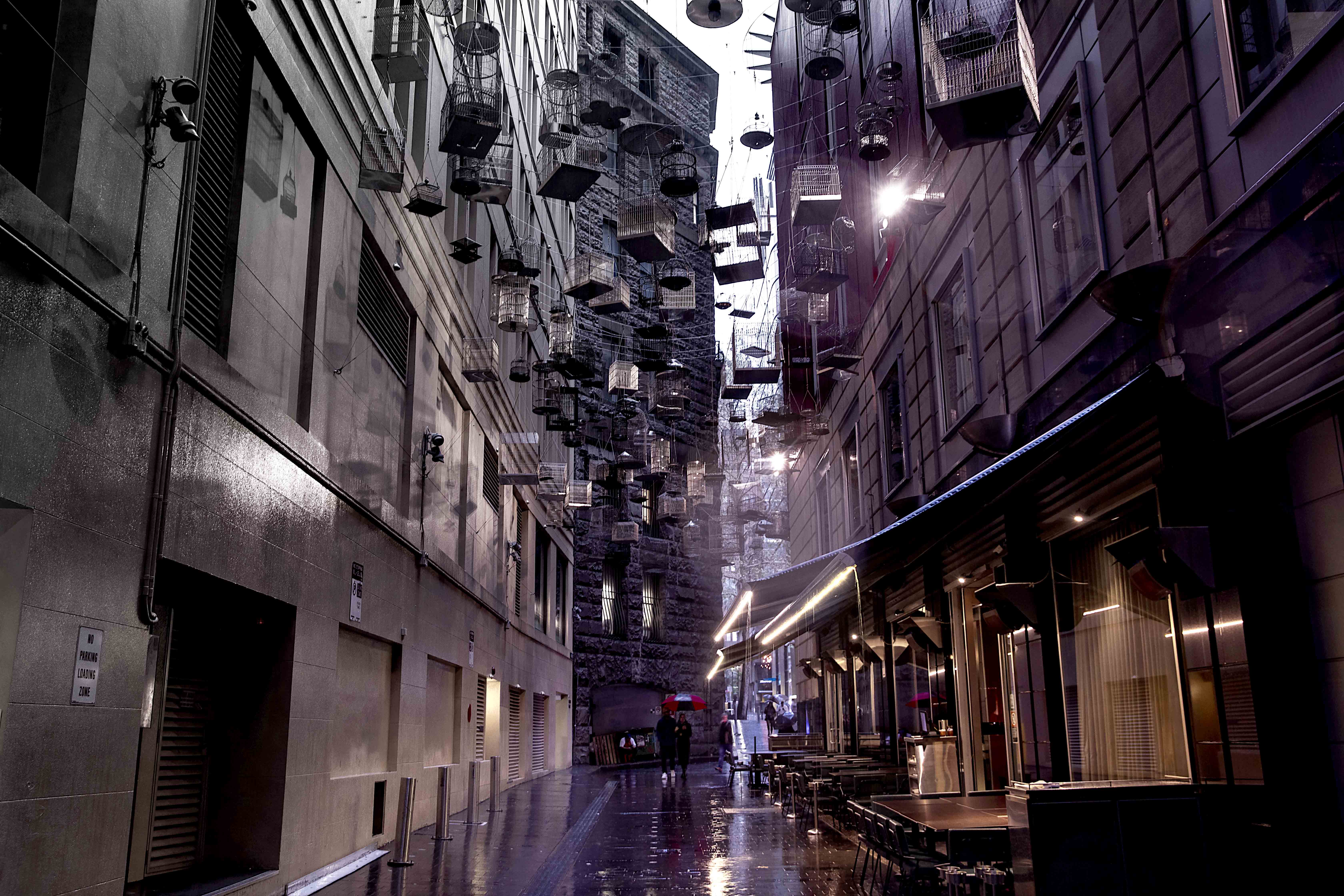 Many visitors to Sydney, and even some locals miss the charming sight of the empty birdcages hanging above Angel Place. As they walk down George Street or Pitt Street between Circular Quay and the shopping area, they might not notice these delightful cages gently swaying overhead. Rain and evening lights definitely add a touch of romance to everything.