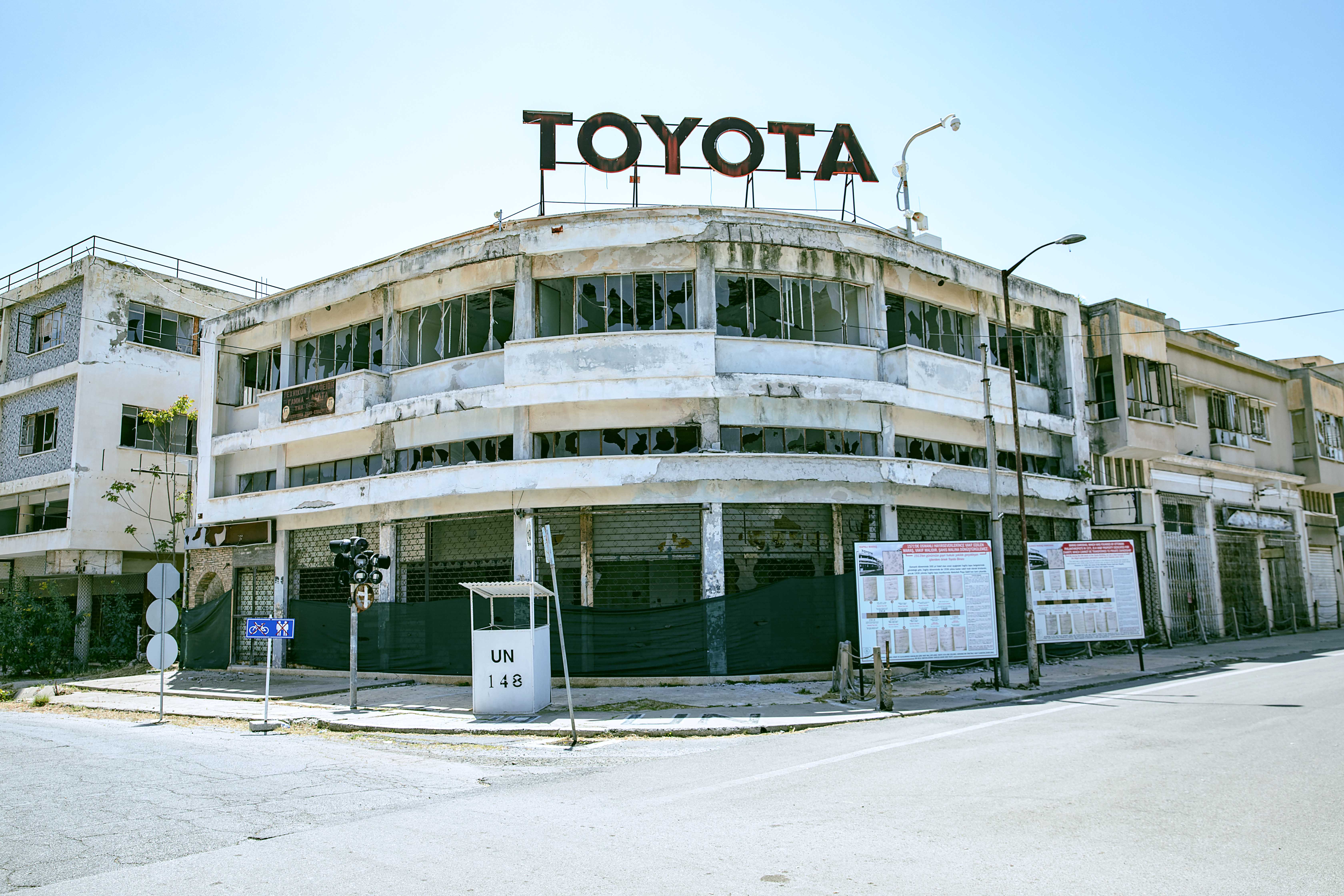 United Nations Peacekeeping Force in Cyprus (UNFICYP) Observation Post 148, located in front of the abandoned Toyota Dealership.